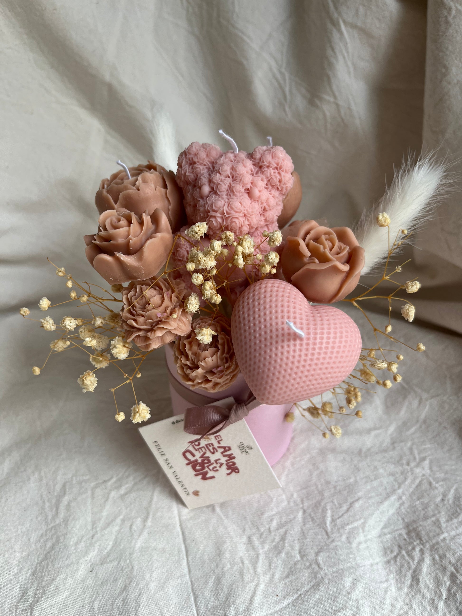 Este bouquet combina velas con mecha + wax melts para derretir. La base es una caja cilíndrica de cartón y se entrega en bolsa blanca con visor