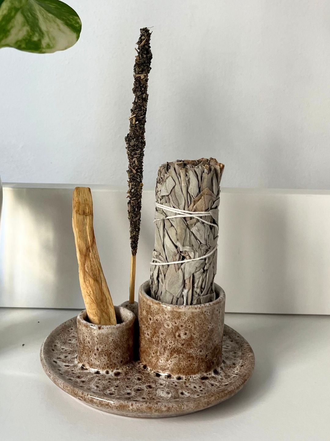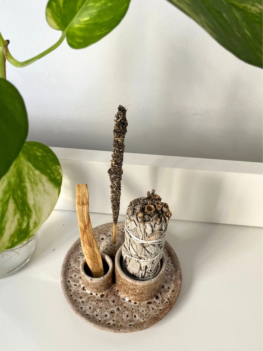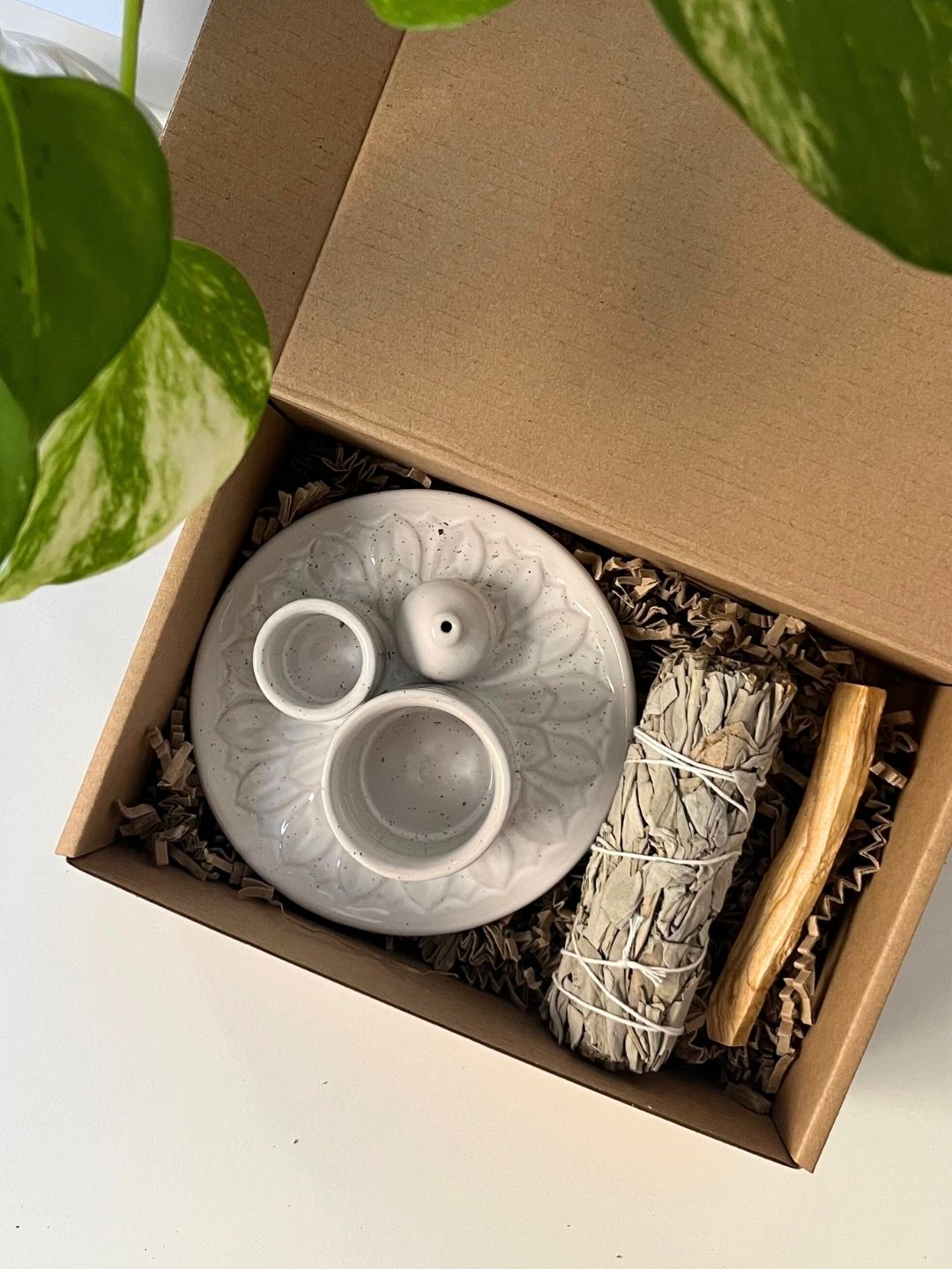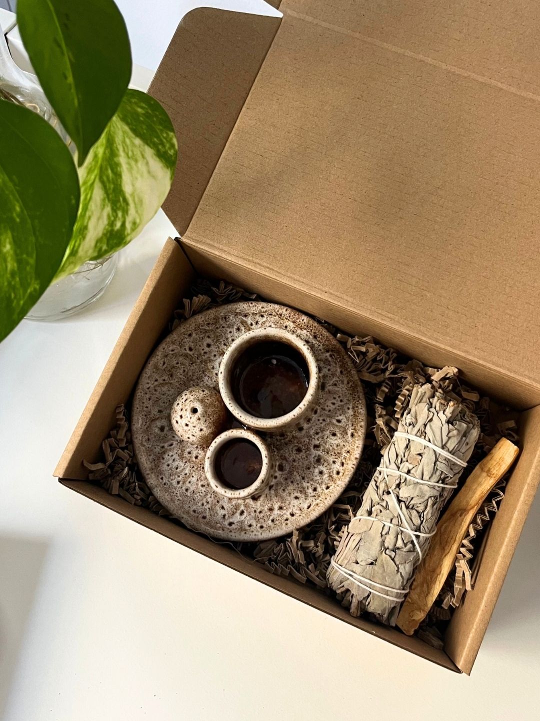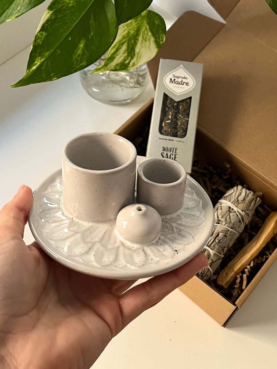 Un pequeño espacio para tus momentos de conexión y calma. Este kit incluye un platito especial donde colocar salvia, palo santo o incienso, acompañado de todos los productos necesarios para crear tu ritual. Cada elemento ha sido seleccionado cuidadosamente para ayudarte a purificar el ambiente, despejar la mente y conectar con tu energía.