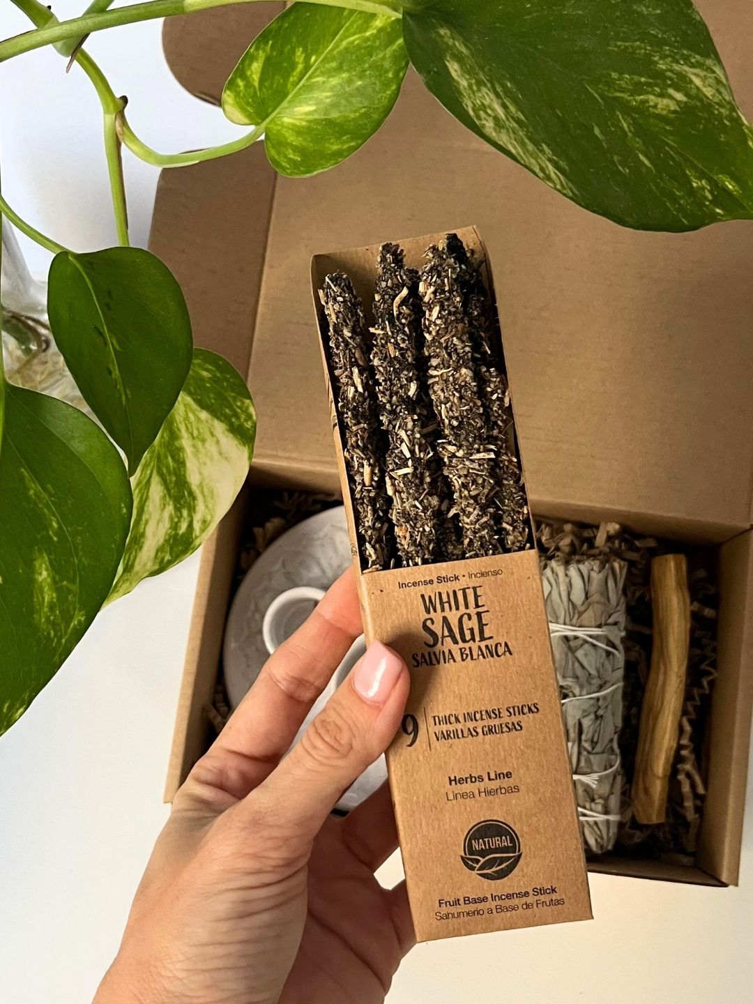 - Incluye una caja con 9 varillas de inciensos naturales Sagrada Madre (la caja puede variar entre salvia, eucalipto u otros)