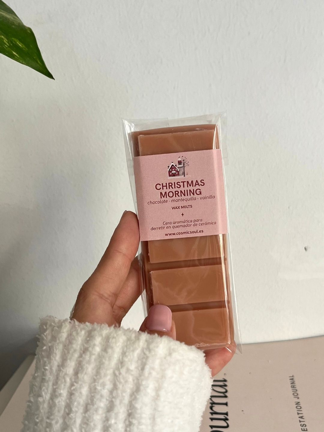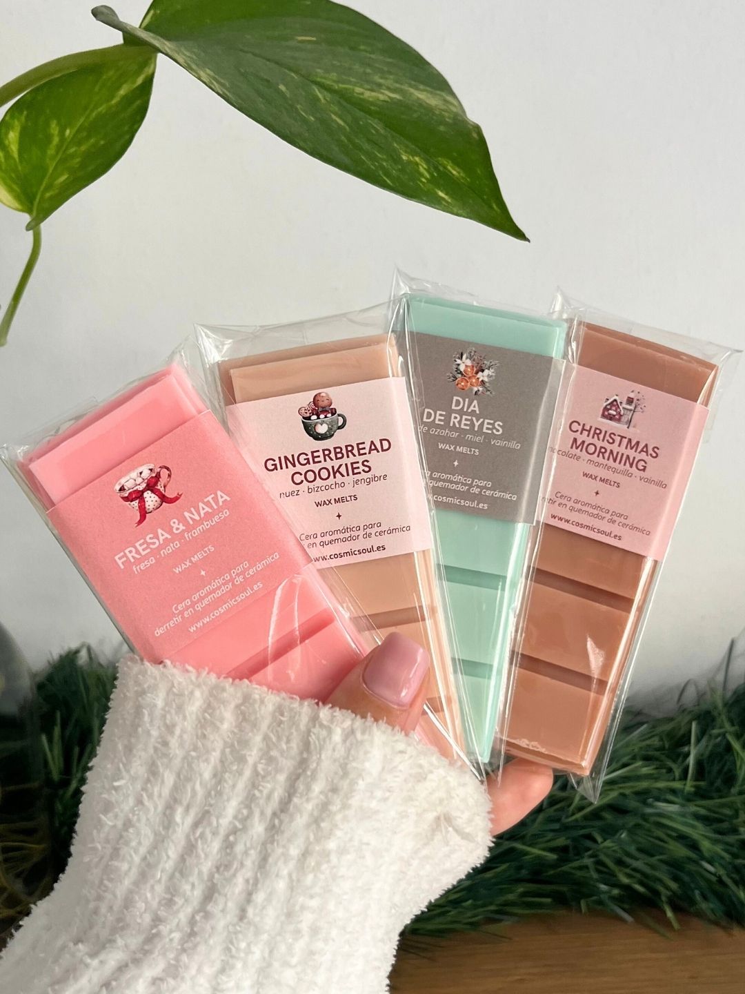 Cada trocito, hecho a mano con cera de soja 100% natural y fragancias veganas, convierte tu hogar en un refugio cálido y lleno de espíritu navideño.